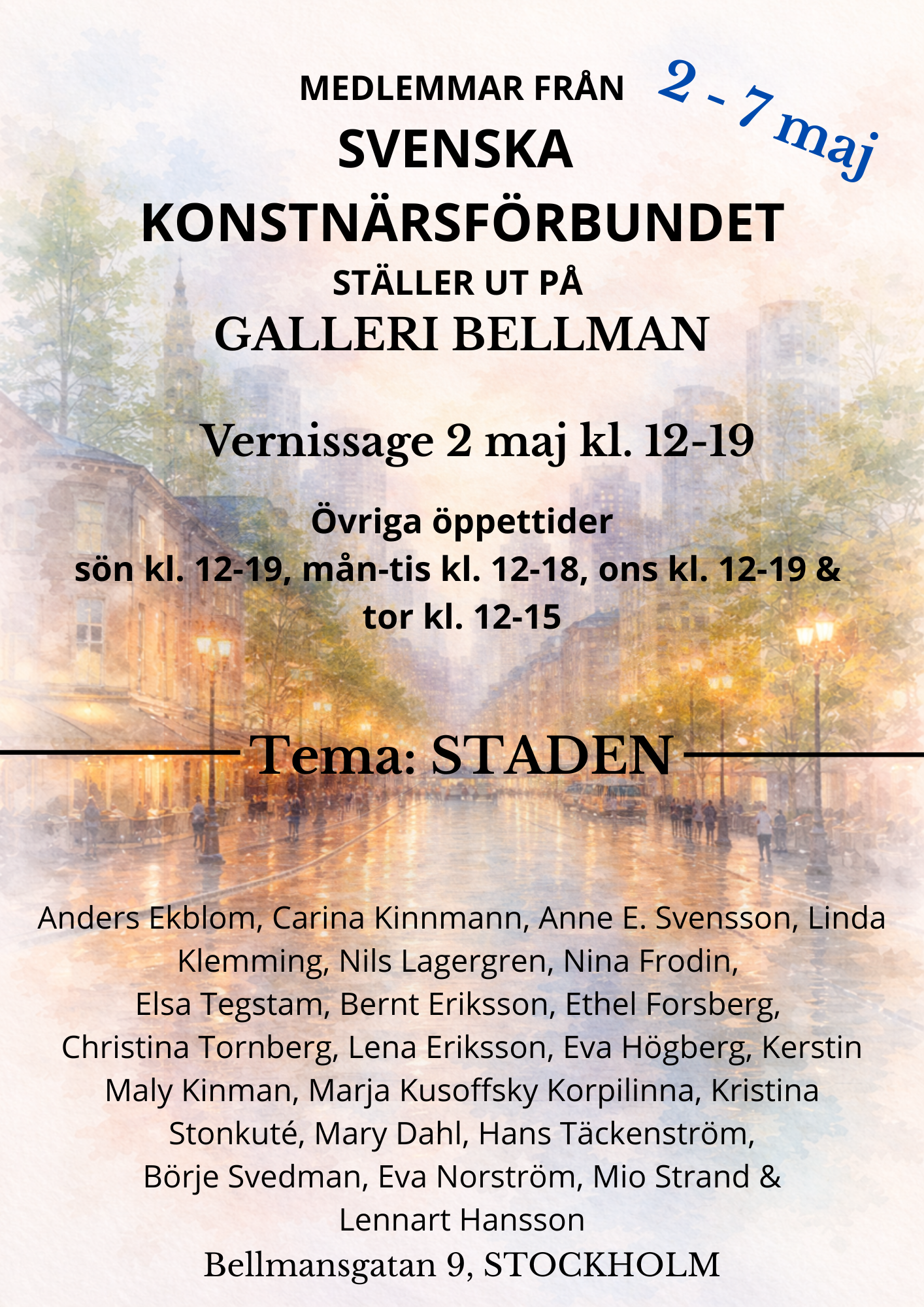 På den här sidan ser du de närmast kommande utställningarna. Gå in på kalendarium 2024/2025/2026/2027 där ser du vilka tider som är lediga. Skicka gärna en intresseanmälan på galleribellman@gmail.com eller ring 0708-293706 även om det ser ut att vara fullbokat just när du önskar ställa ut. Det kan komma återbud. Vi samarbetar med Svenska Konstnärsförbundet.