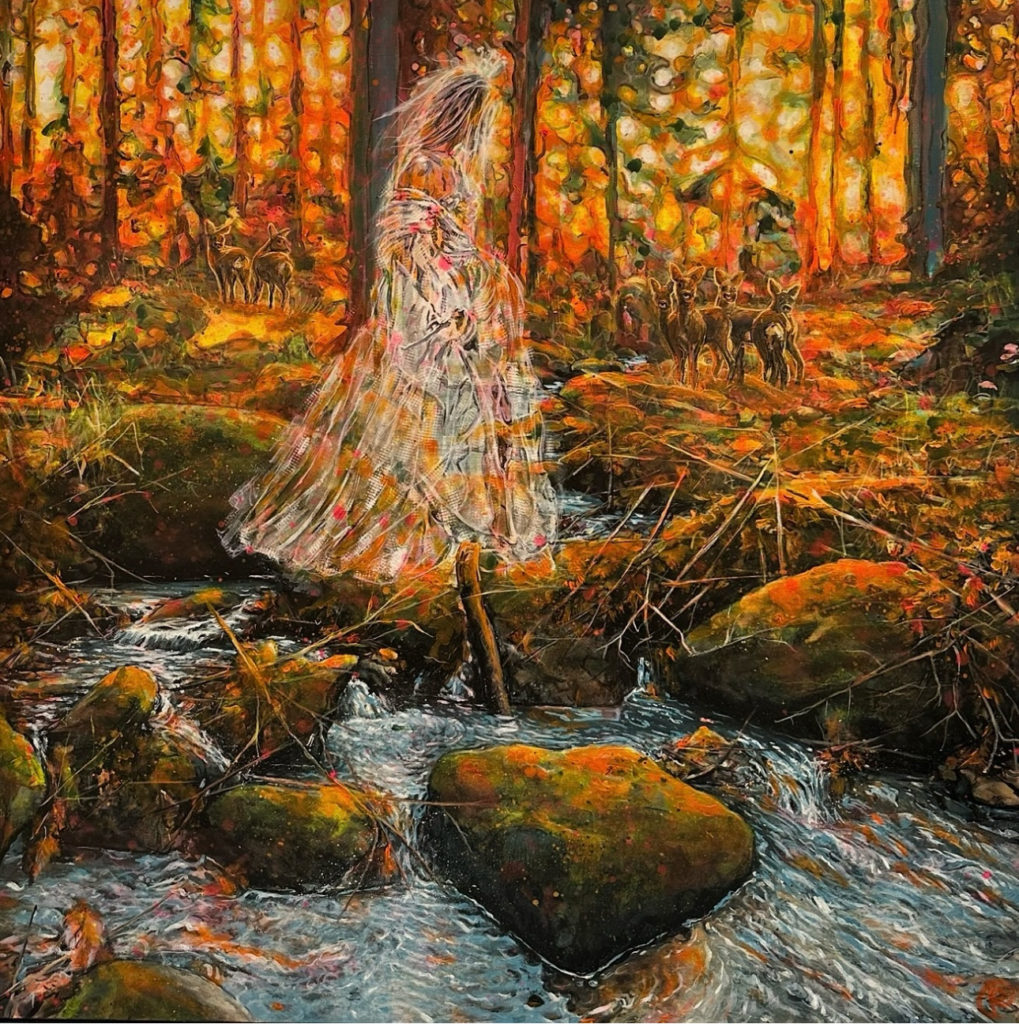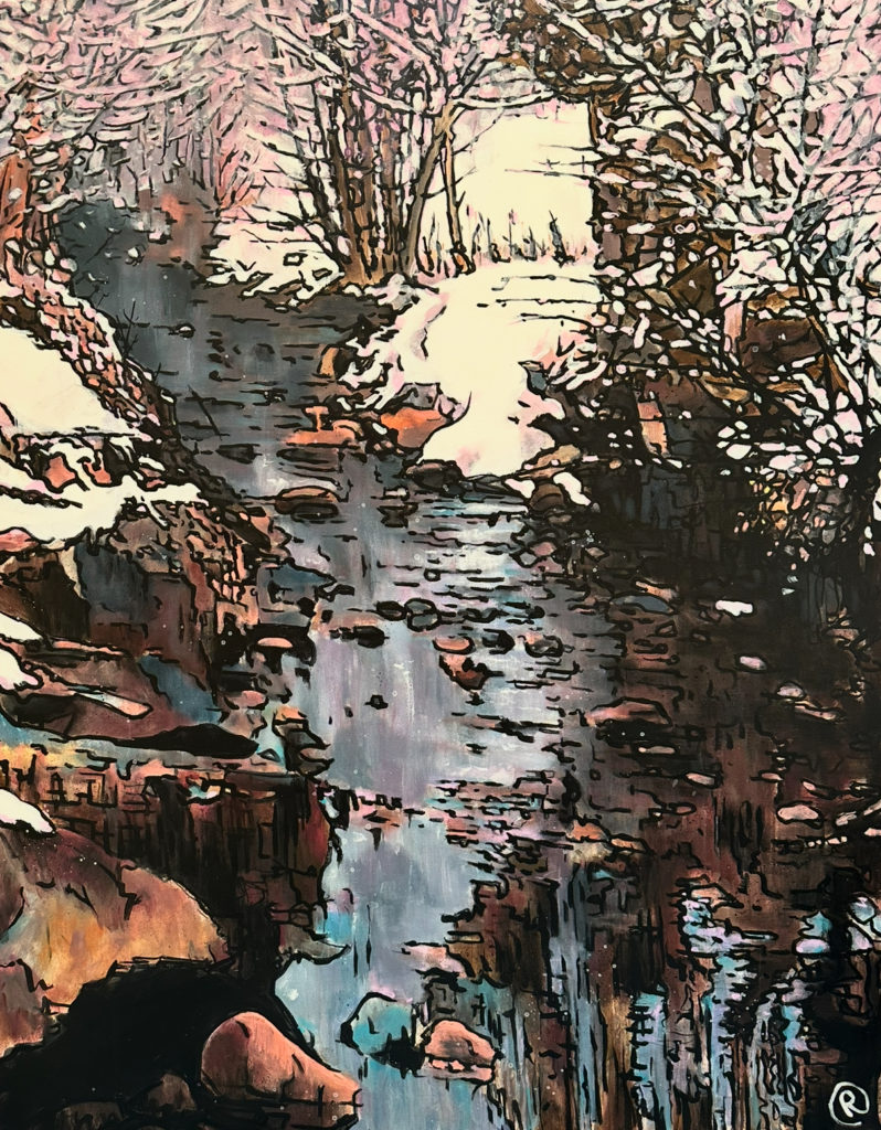 Jag bygger upp målningen med blyerts, akryl och ofta med mycket vatten så färgen får skapa sina egna mönster.