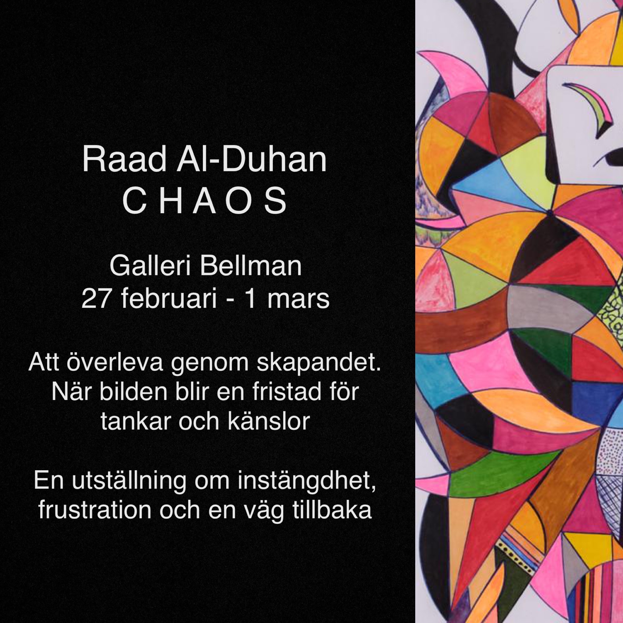 Varmt välkommen att delta i utställningen Kaos med Raad Al-Duhans bildspråk. En resa att överleva fångenskap. Fångad av normer, kultur, statiska sociala föråldrade tankar och att resa sig ur askan.